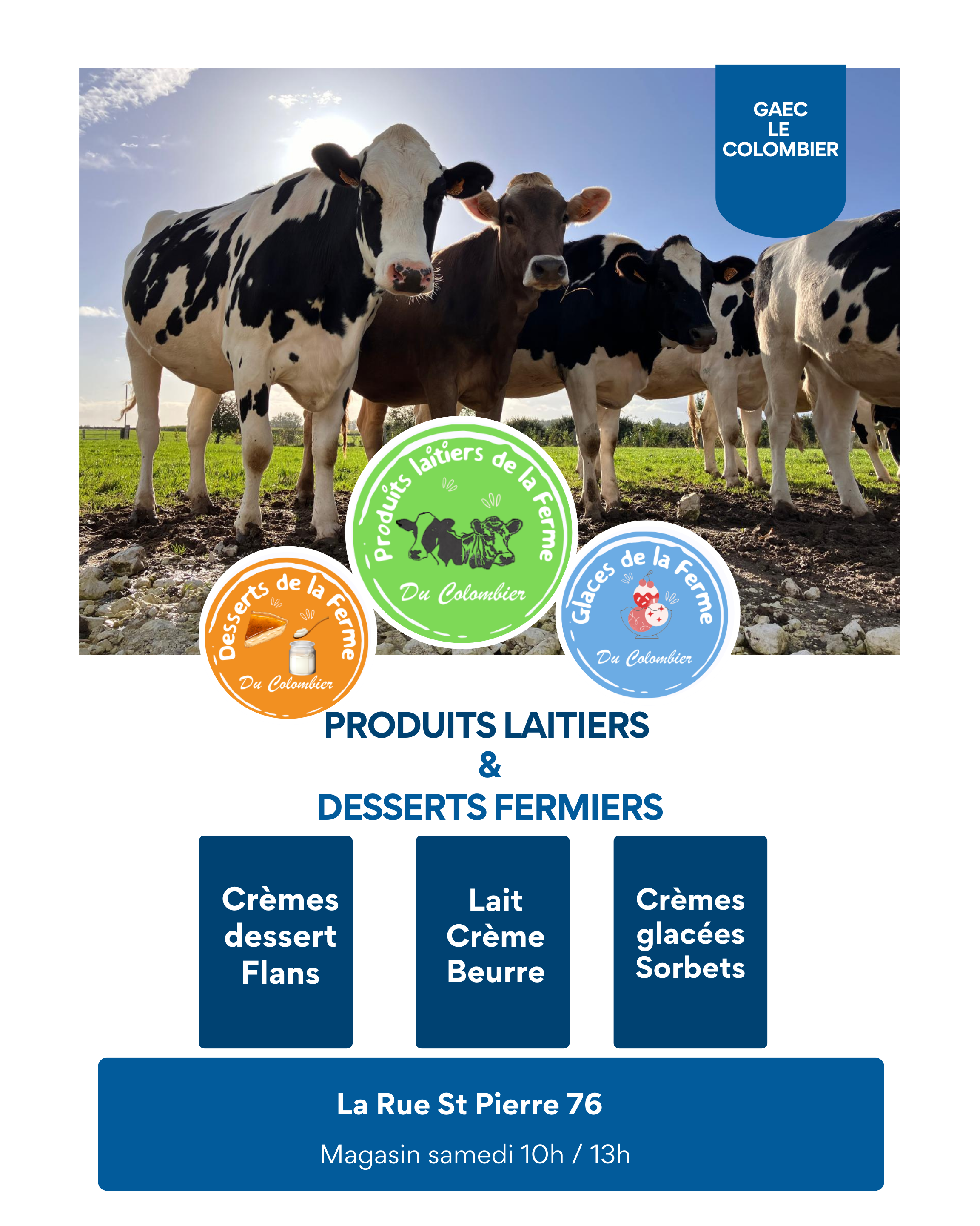 Agriculteurs en élevage laitier, nous transformons le lait de nos vaches en crèmes glacées, flans à l'ancienne, crèmes dessert, crème crue et beurre cru.